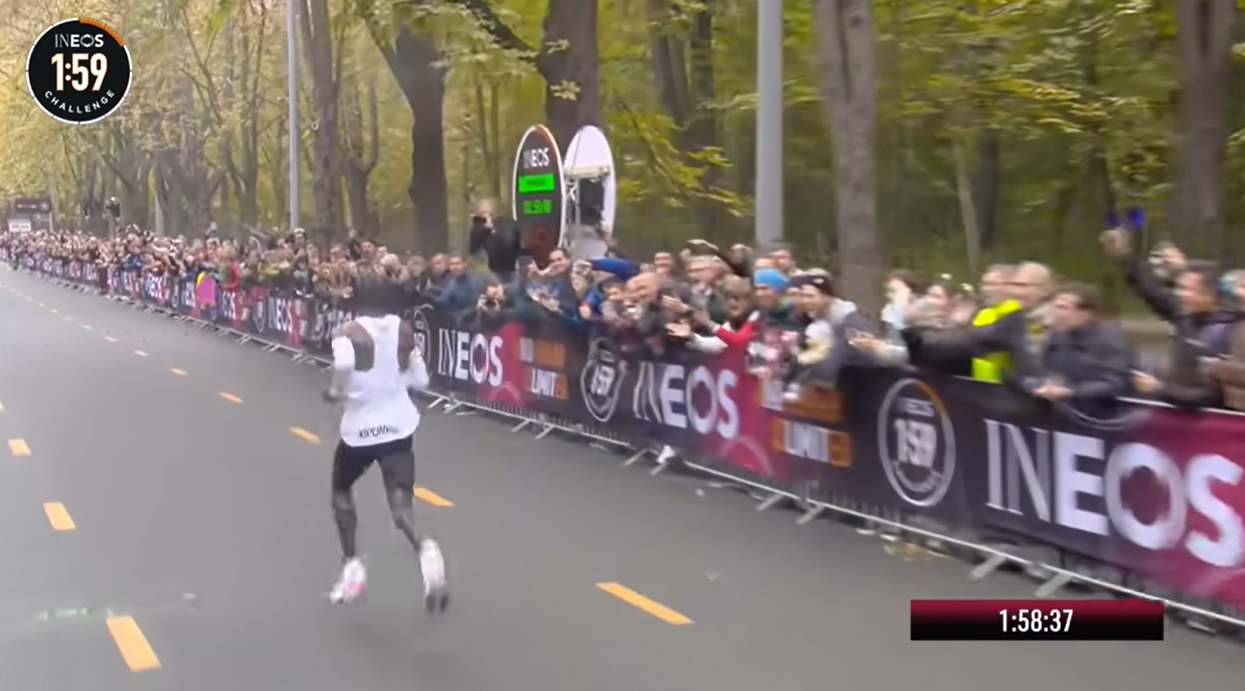 사실 킵초게는 이미 2시간 안짝으로 완주한 기록이 있습니다. 이네오스 1:59 챌린지 레이스에서 1시간 59분 40초의 기록으로 완주하여 인류 최초로 2시간 이내에 마라톤 풀코스를 달린 선수가 되었던 것입니다. 그러나 이날 마라톤은 킵초게를 위해 특별히 마련한 레이스였기에 국제육상연맹으로부터 정식 기록을 인정받지는 못했습니다.